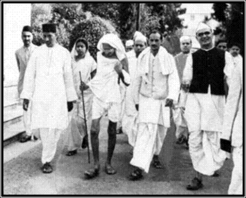 G.D. Birla accompanying Mahatma Gandhi on his stroll from the Birla House, New Delhi |